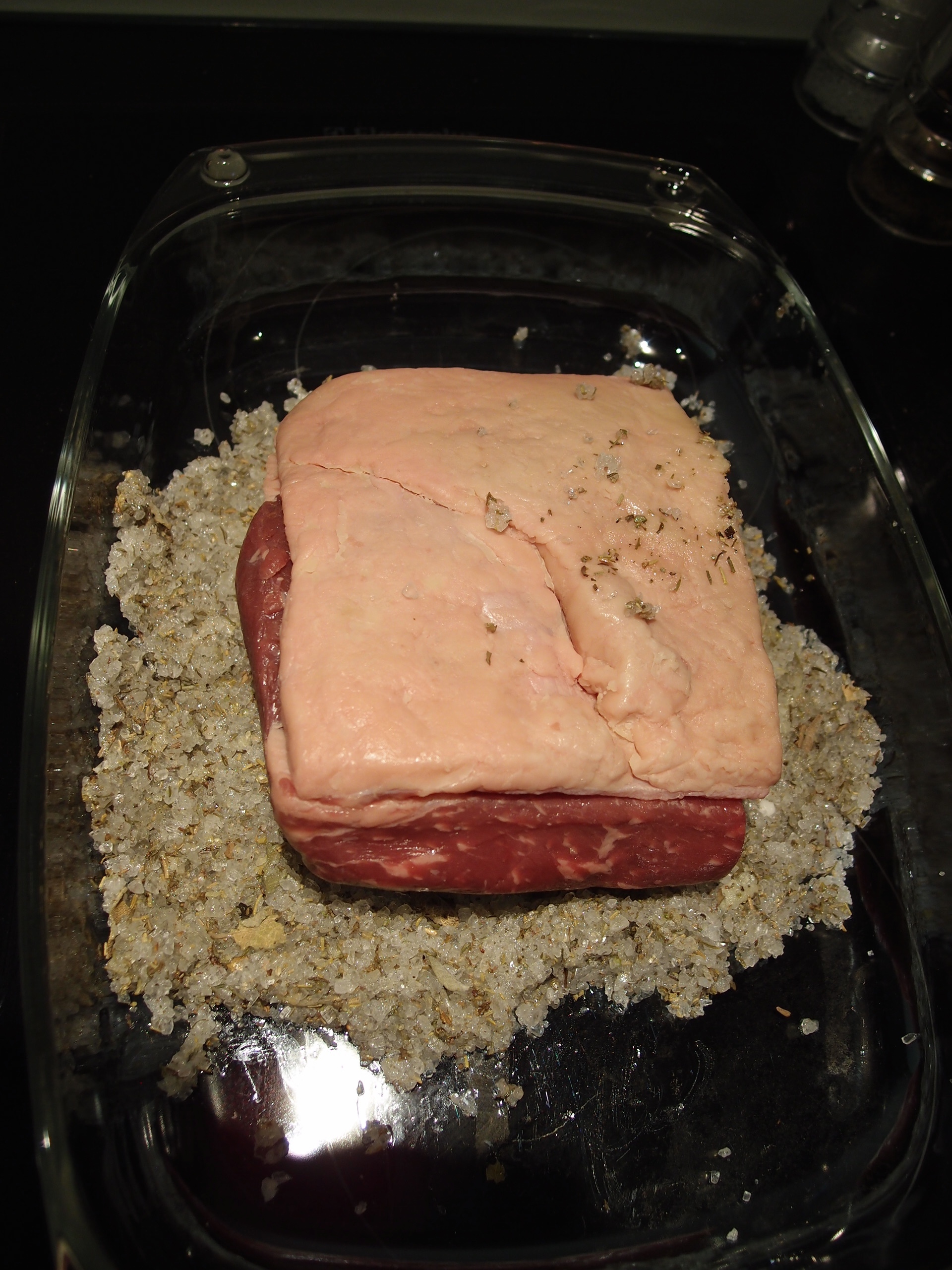 Take an oven pan and put roughly 1 cm of the salt mix on the bottom. Place the Roastbeef on top and make sure to cover well with the rest of the mix. Put it in a preheater oven at 210 degrees.