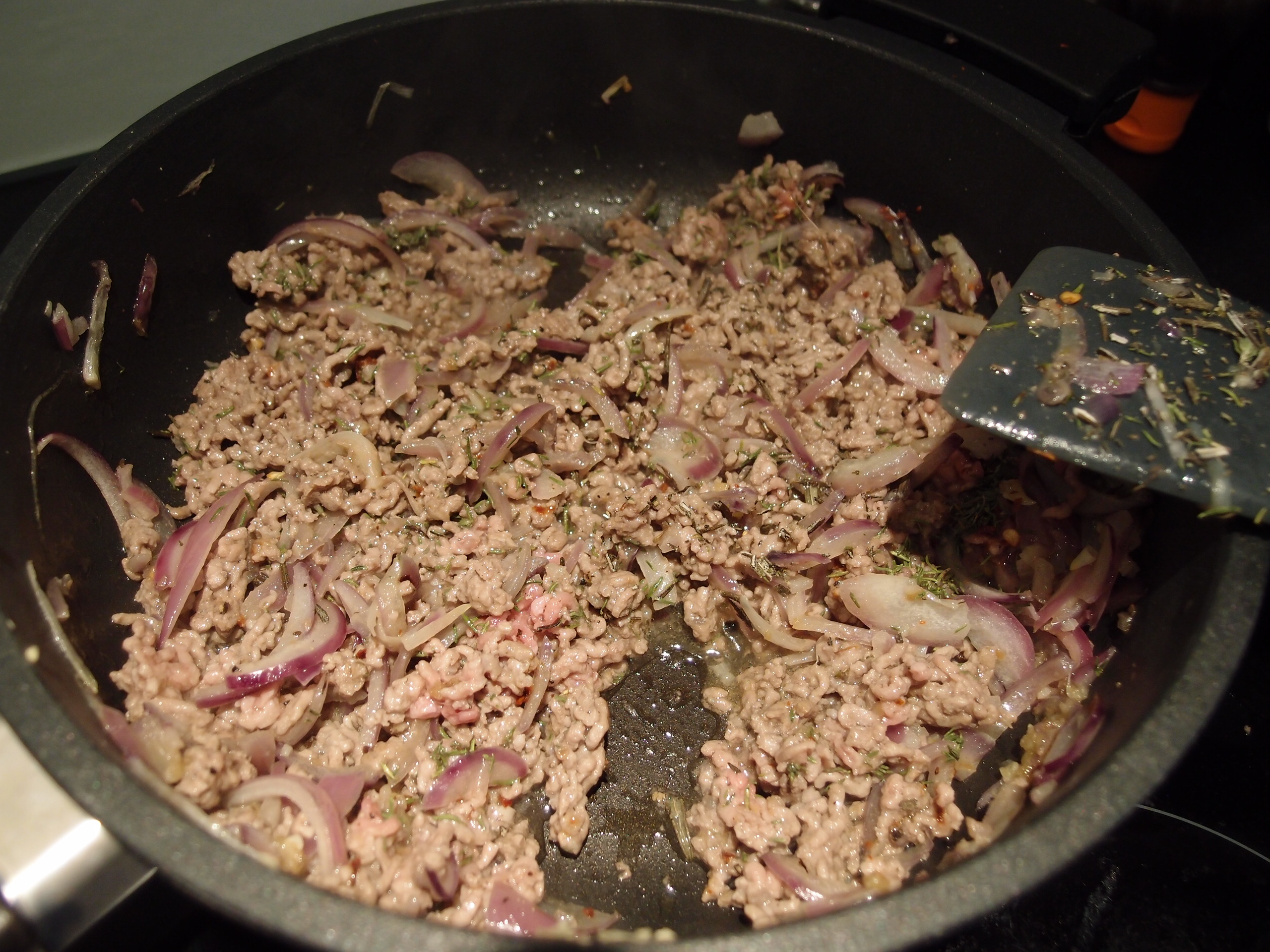 Add the minced meat till it is golden. Add pepper, salt and the thymian. Add the beef stock and let simmer for around 20 minutes.