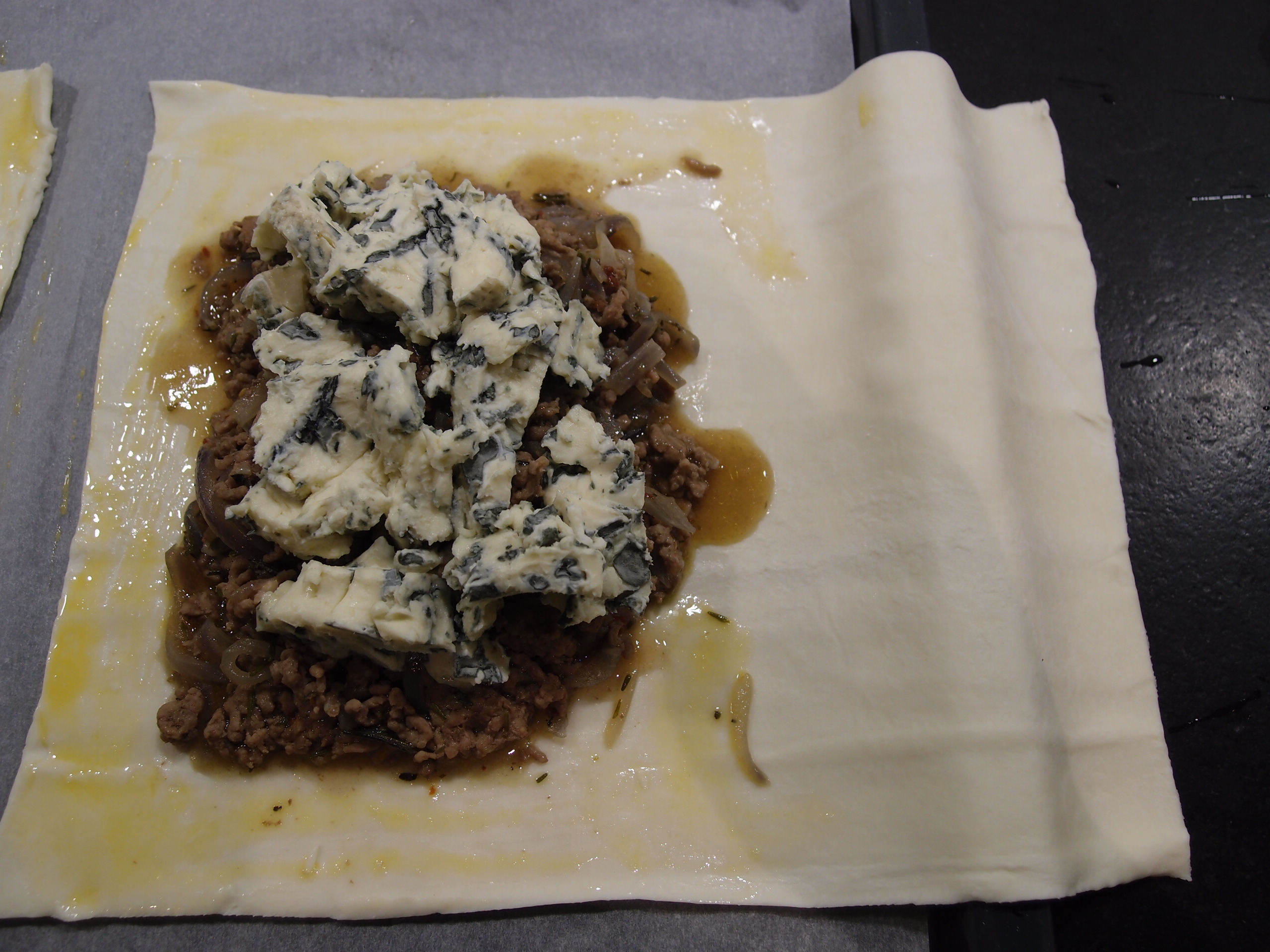 Add the cooked meat on one half of each puff pastry square making sure to leave 3 cm free from the border.