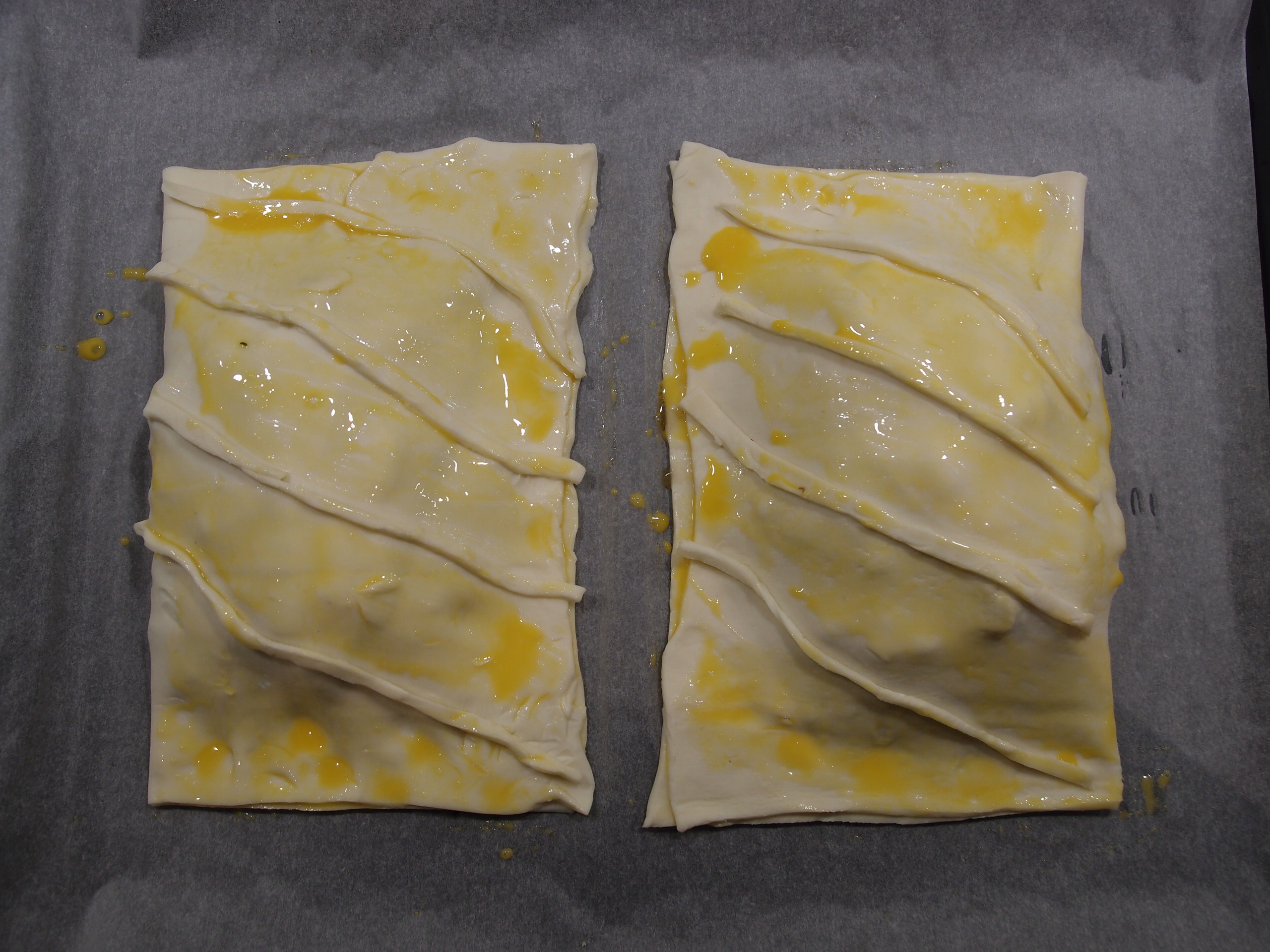 Cover with the other half of the pastry and make sure that the borders are sealed. Brush the rest of the egg on the top and put in the oven. Bake till golden-brown.