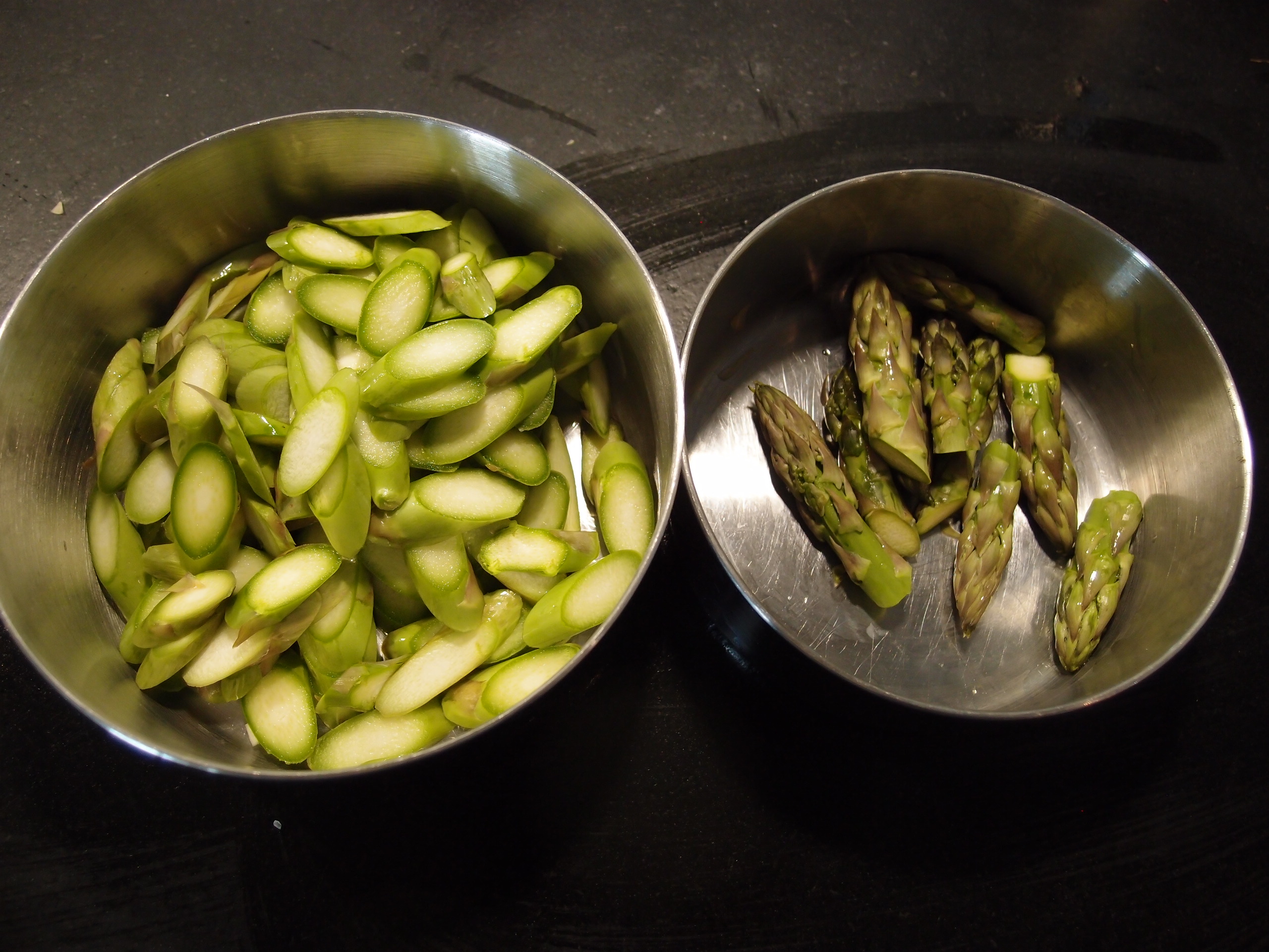 Prepare the asparagus. Cut the tips and then cut the rest in slices.
