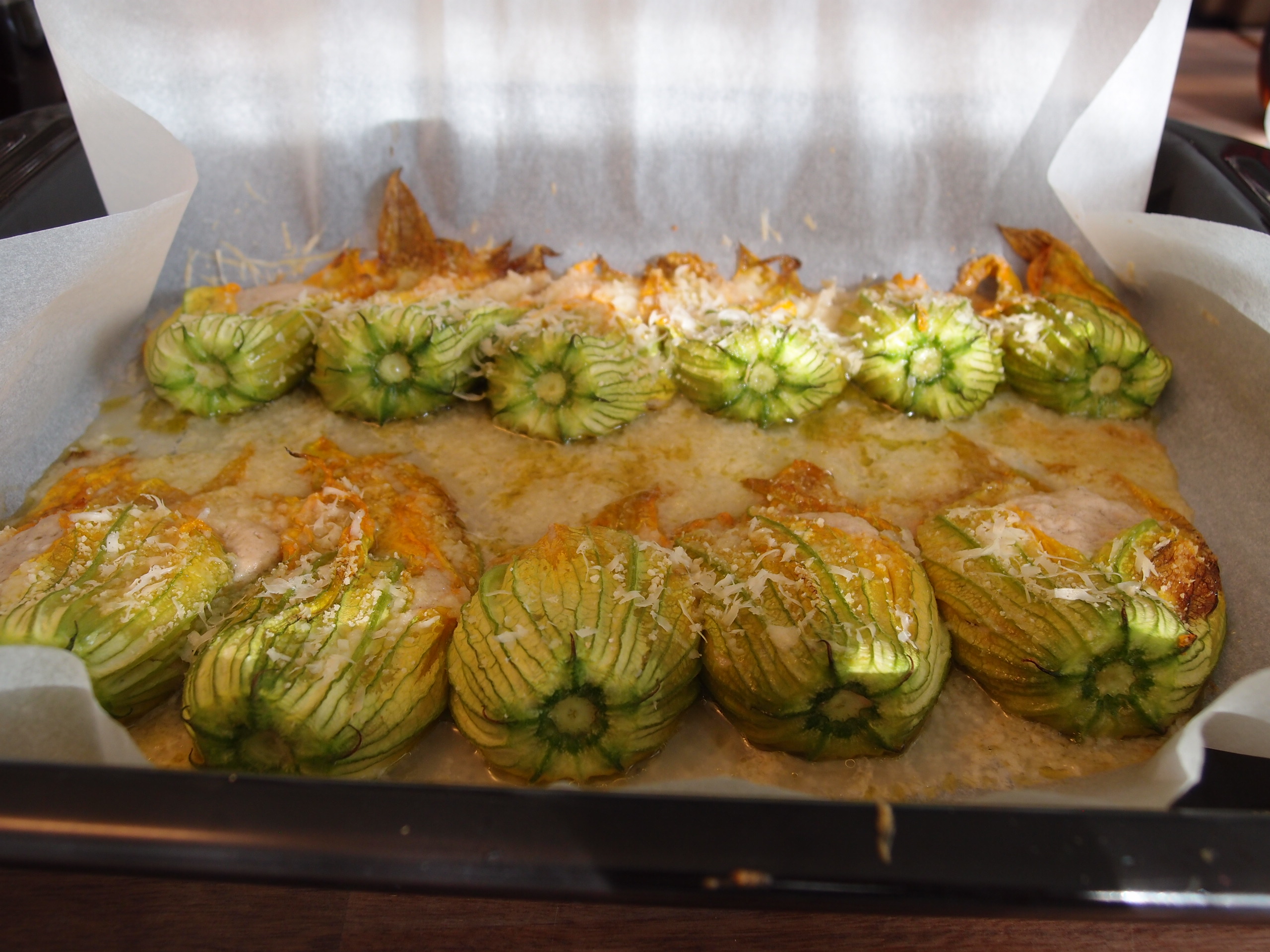 Fill the flowers with a couple of teaspoon of the mix and carefully close them and put the on a baking tin.
