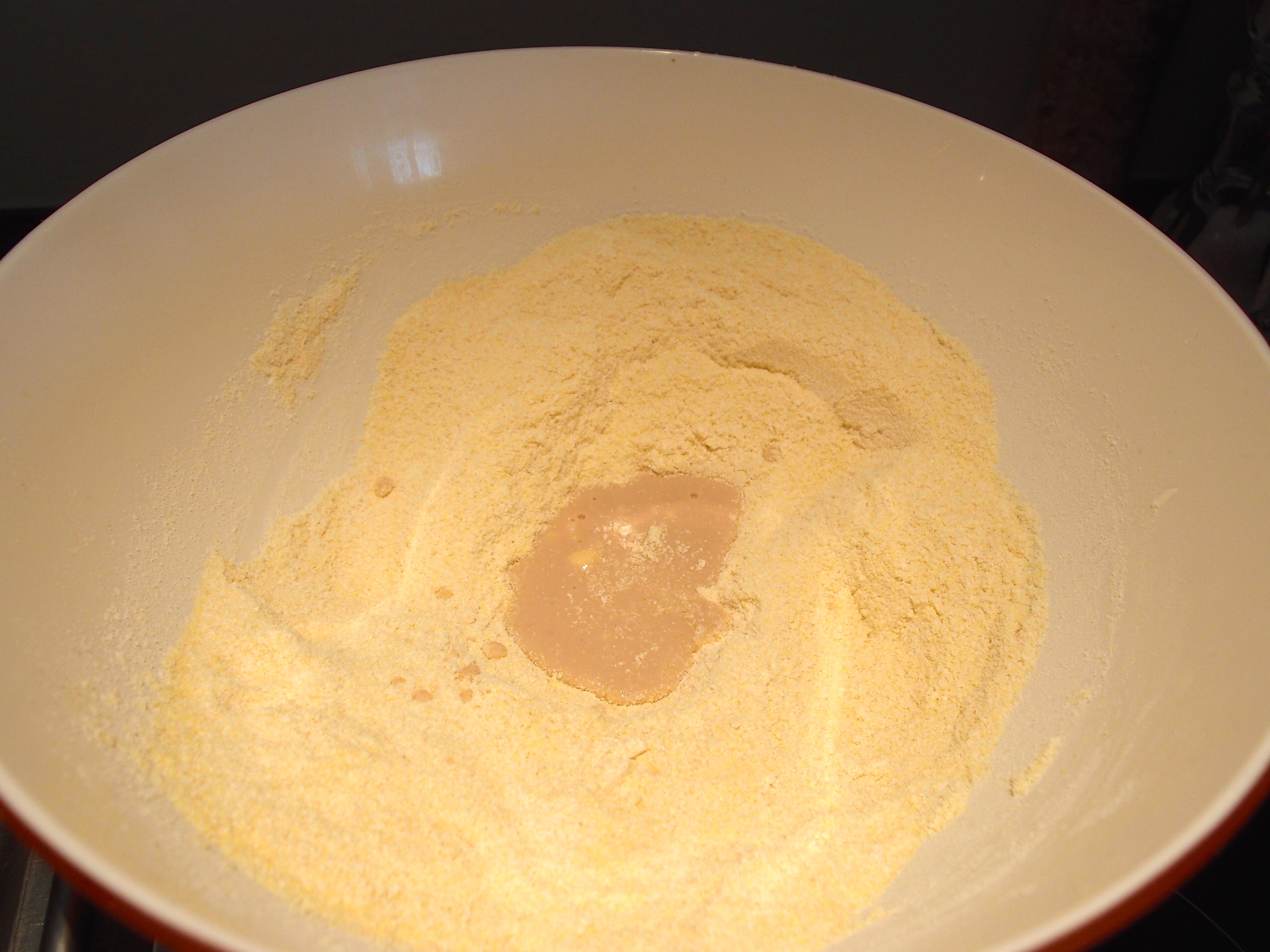 Put the Yeast (in my case liquid) in the middle and start to mix with the flour.