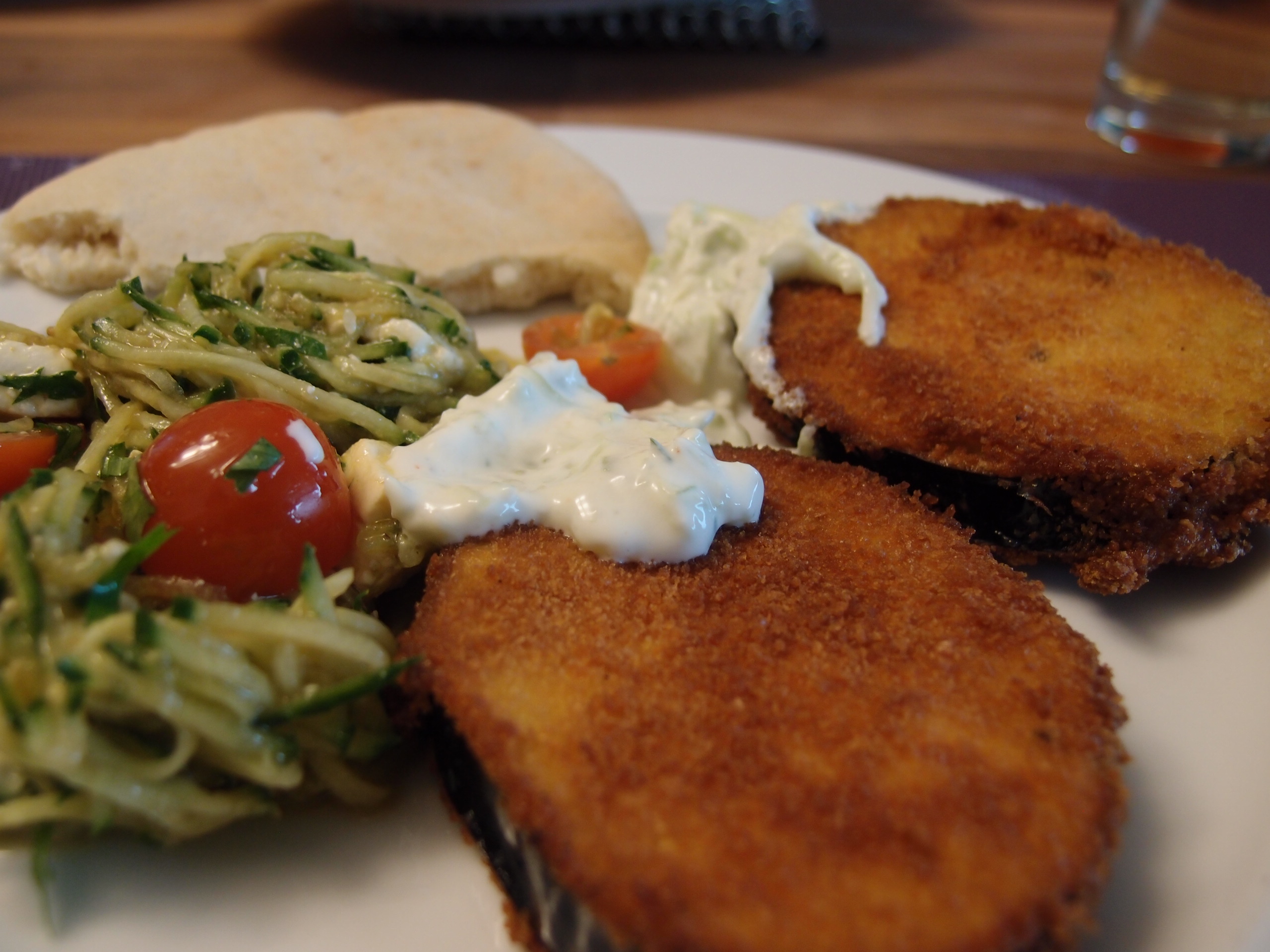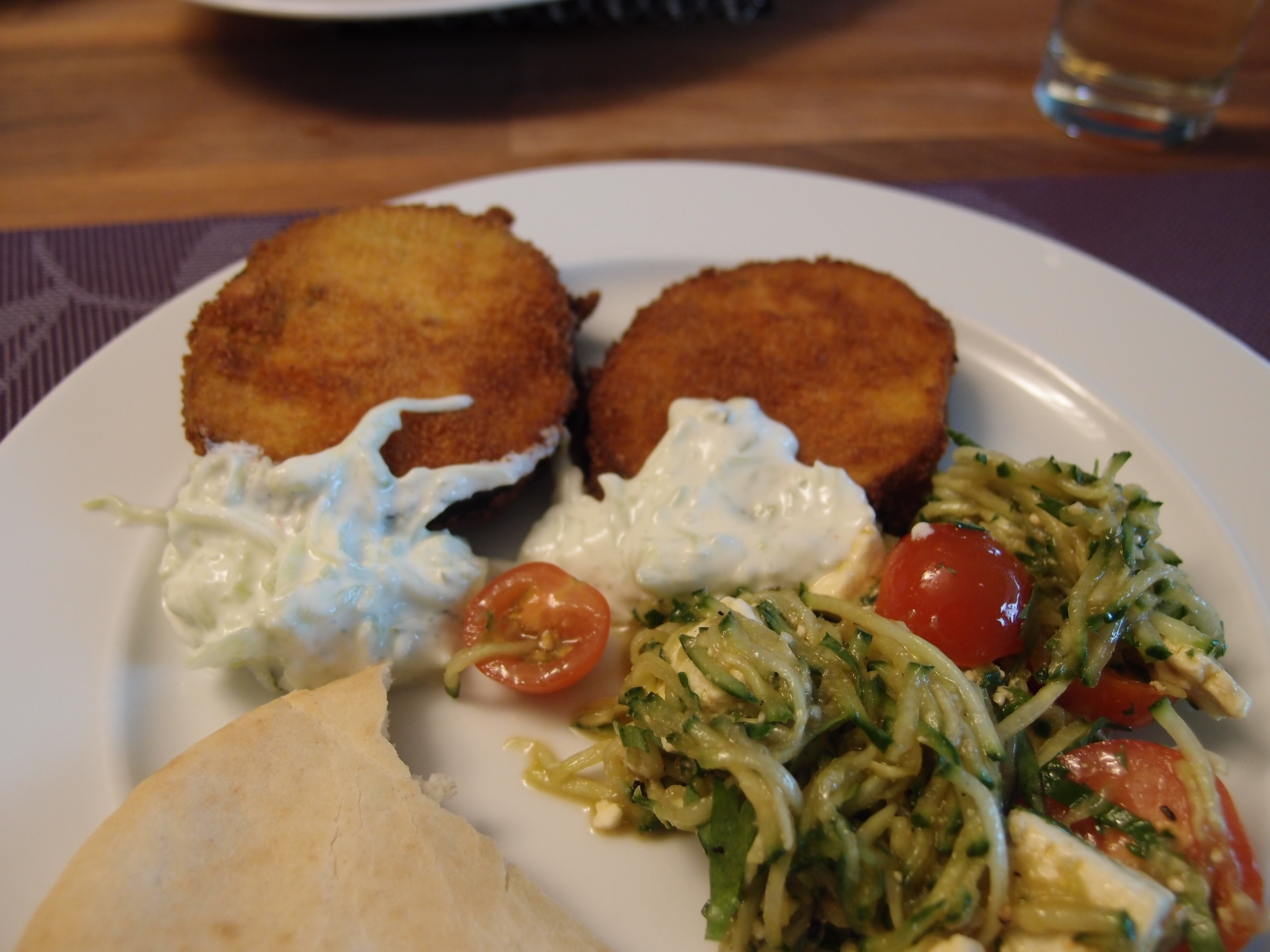 Fry them in oil. While letting cool down prepare the tsatsiki with 175 gr. Greek Yoghurt, half a cucumber, 2 garlic cloves, salt ,pepper, a little bit of tabasco and some fresh cilantro.