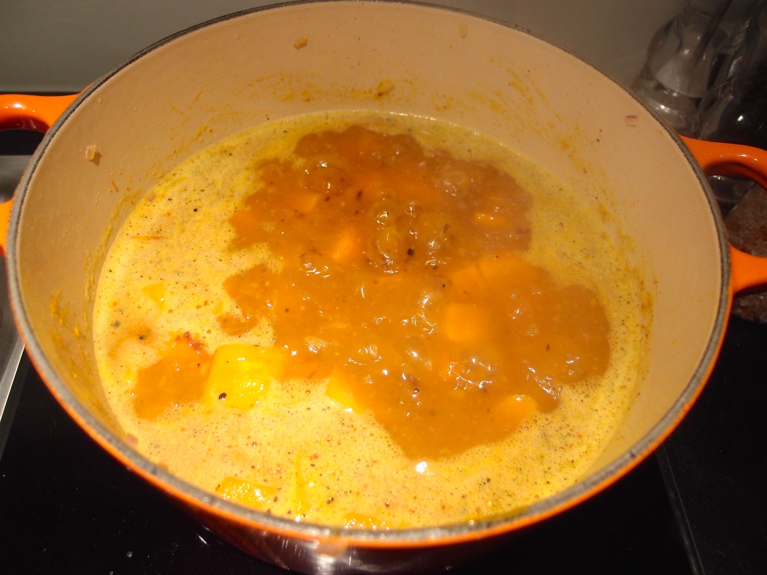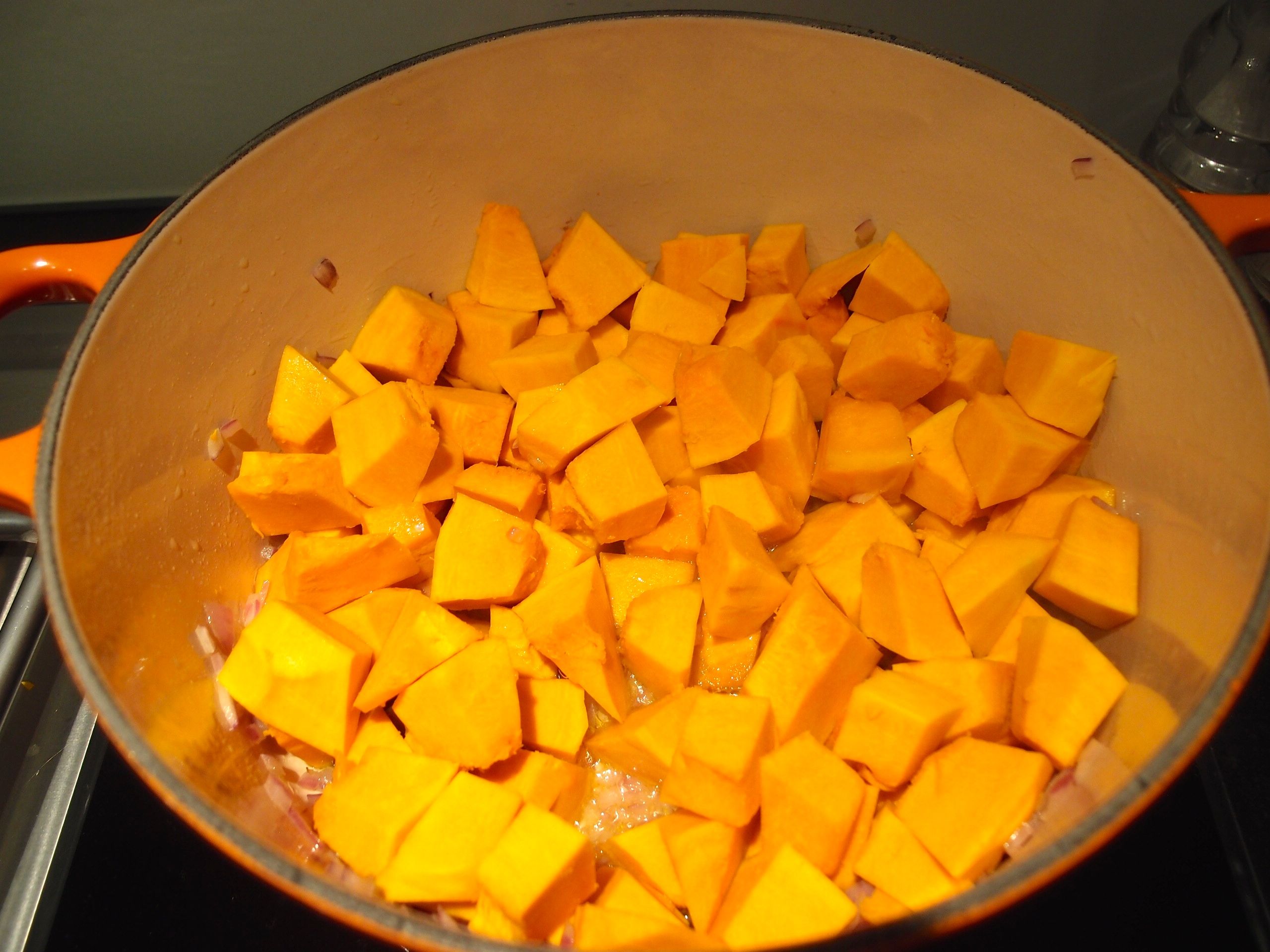 Add the pumpkin and cook for 10 minutes stirring from time to time.