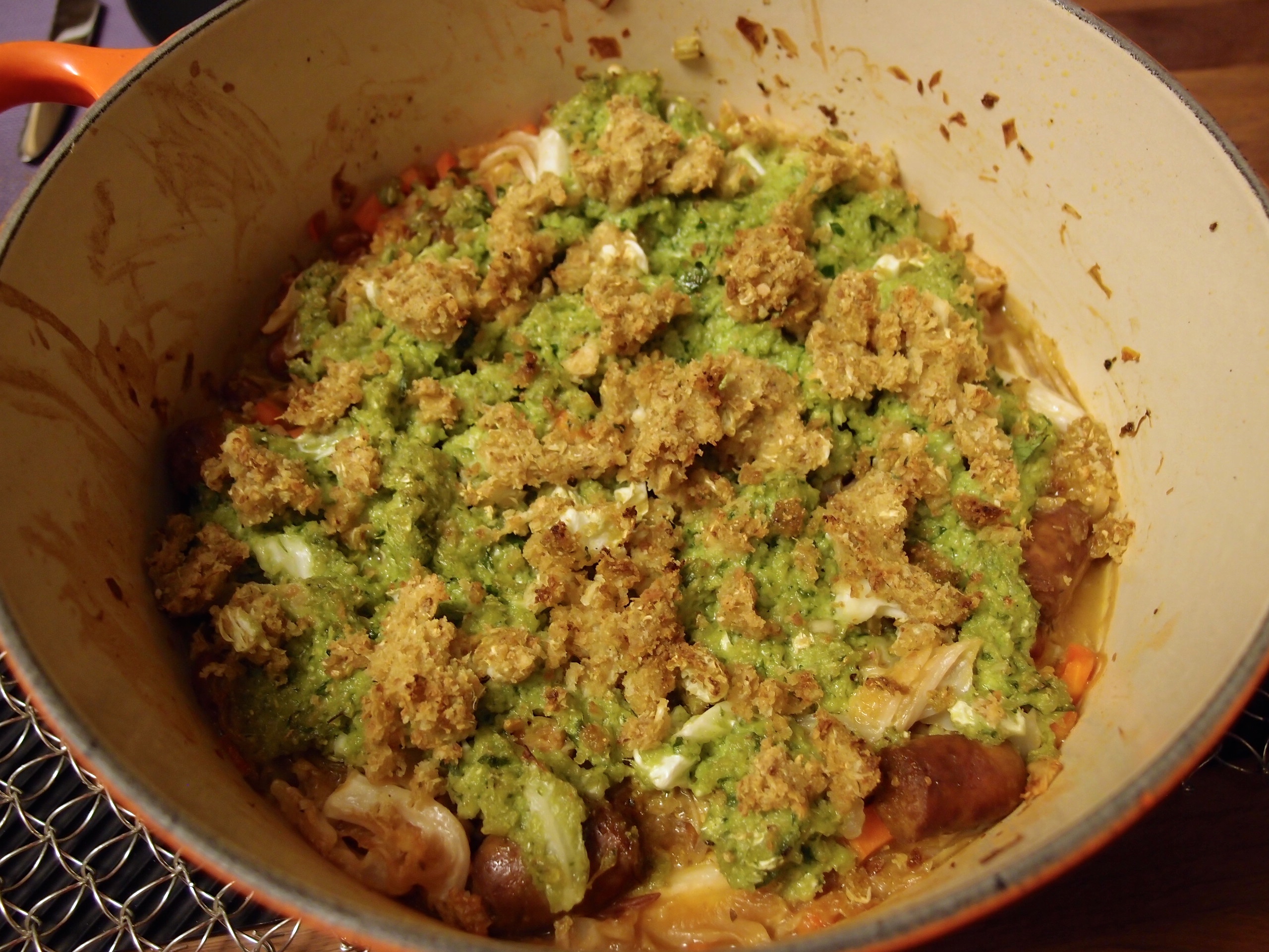 I was inspired by a recipe shown on a BBC show (the original recipe is Quick sausage casserole with Savoy cabbage pesto and you can find it on bbc.co.uk/food )