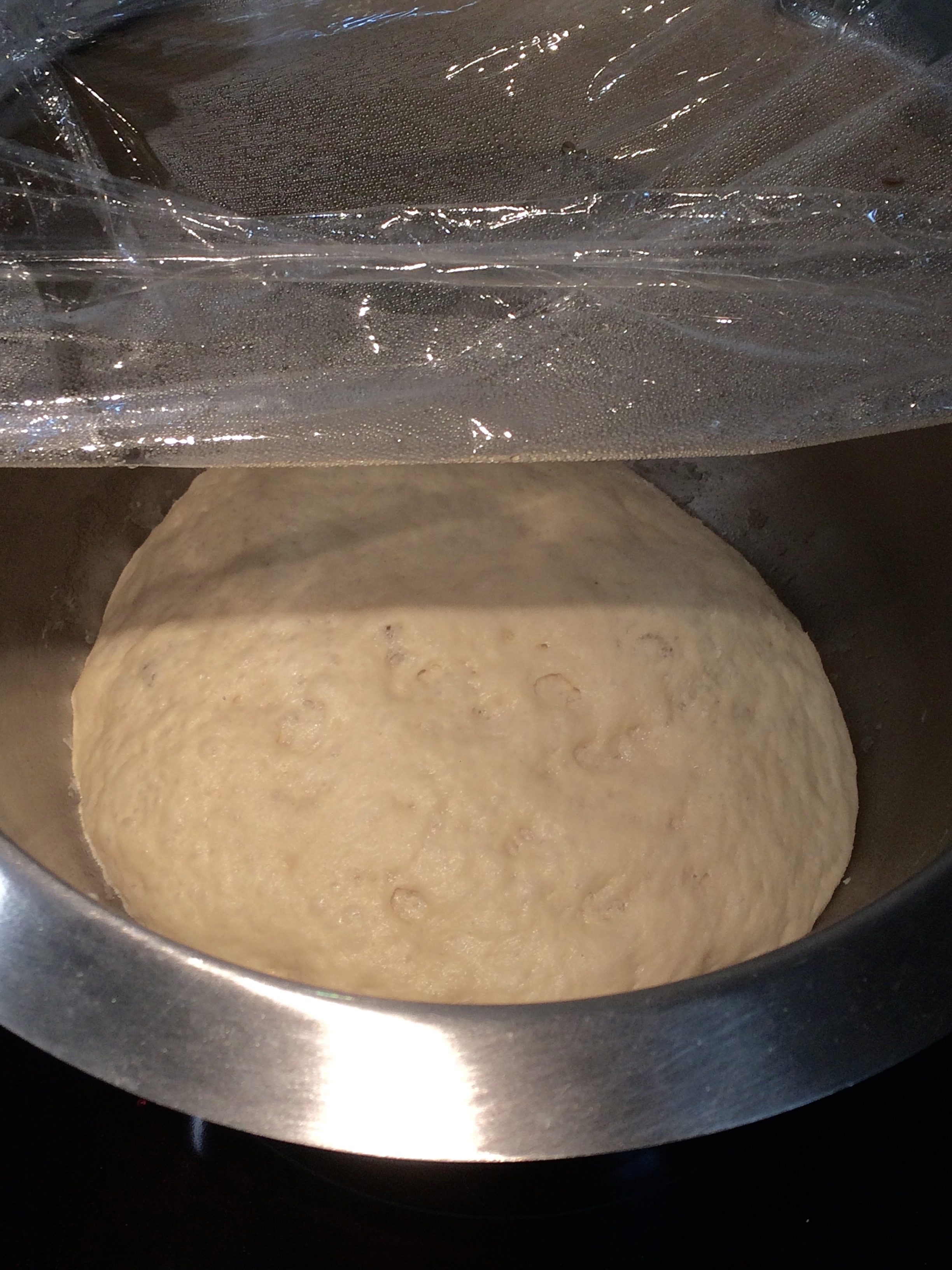 After mixing the yeast in the warm water, put all the ingredients in you mixer bowl and let it work for a while until you have a nice even dough. Take a bowl and grease it with oil, place the dough in it and cover with a plastic film. Let it rest for about 1 hour.