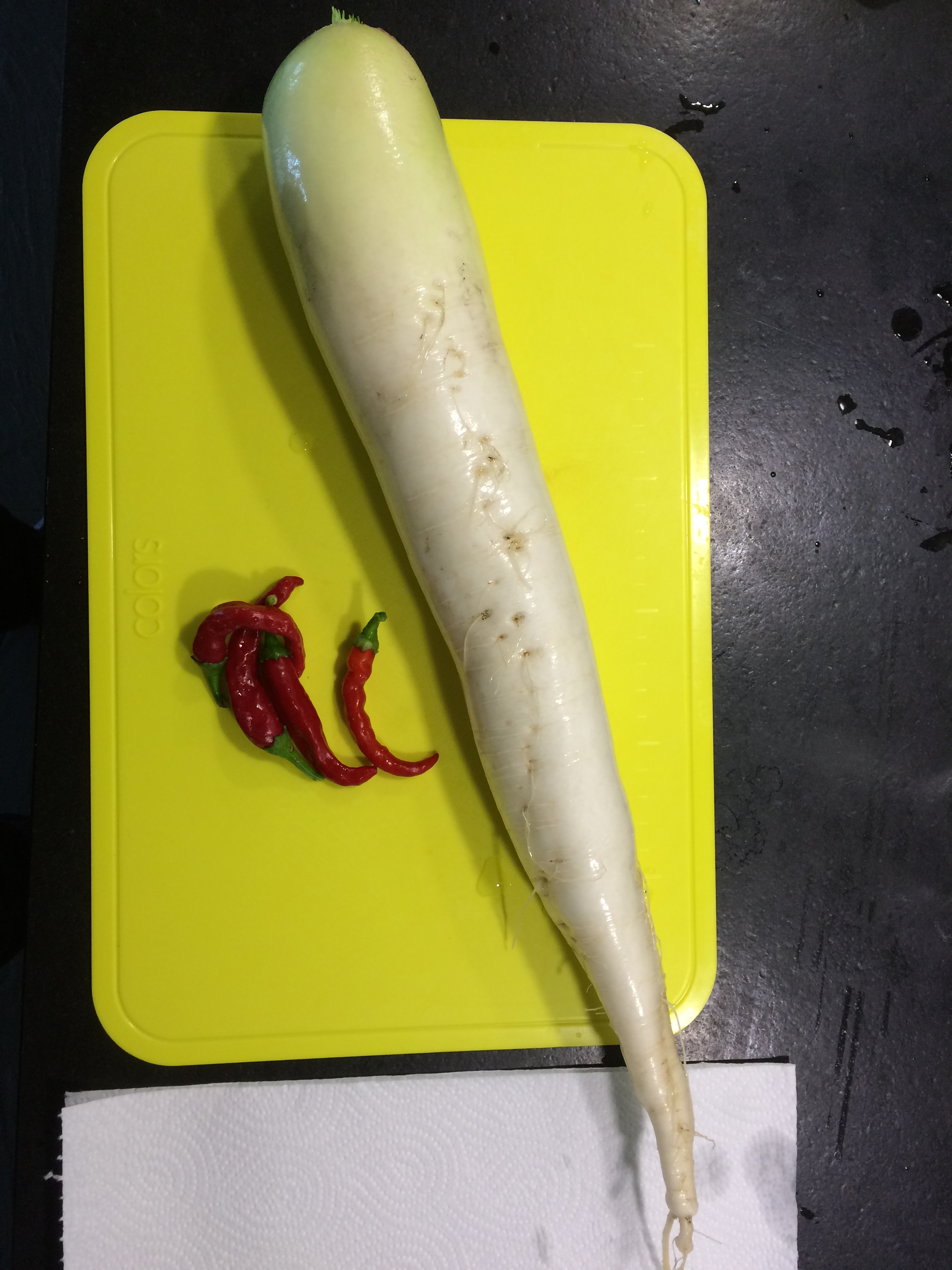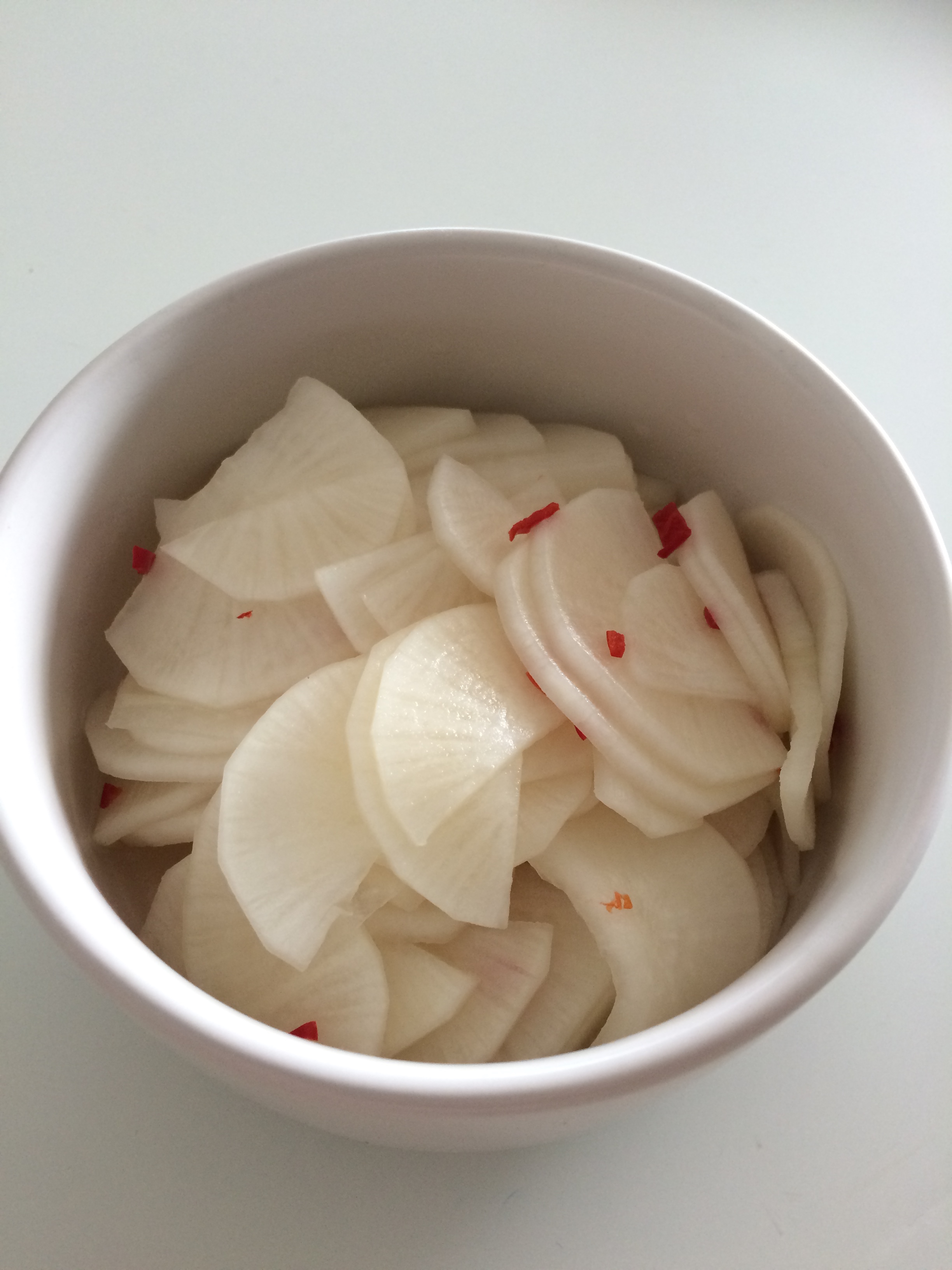 As we harvested 2 nice daikon in our garden and some nice chillies I decided to prepare them as pickles. It was a huge success and around 1 kg of pickles disappeared within 30 minutes…