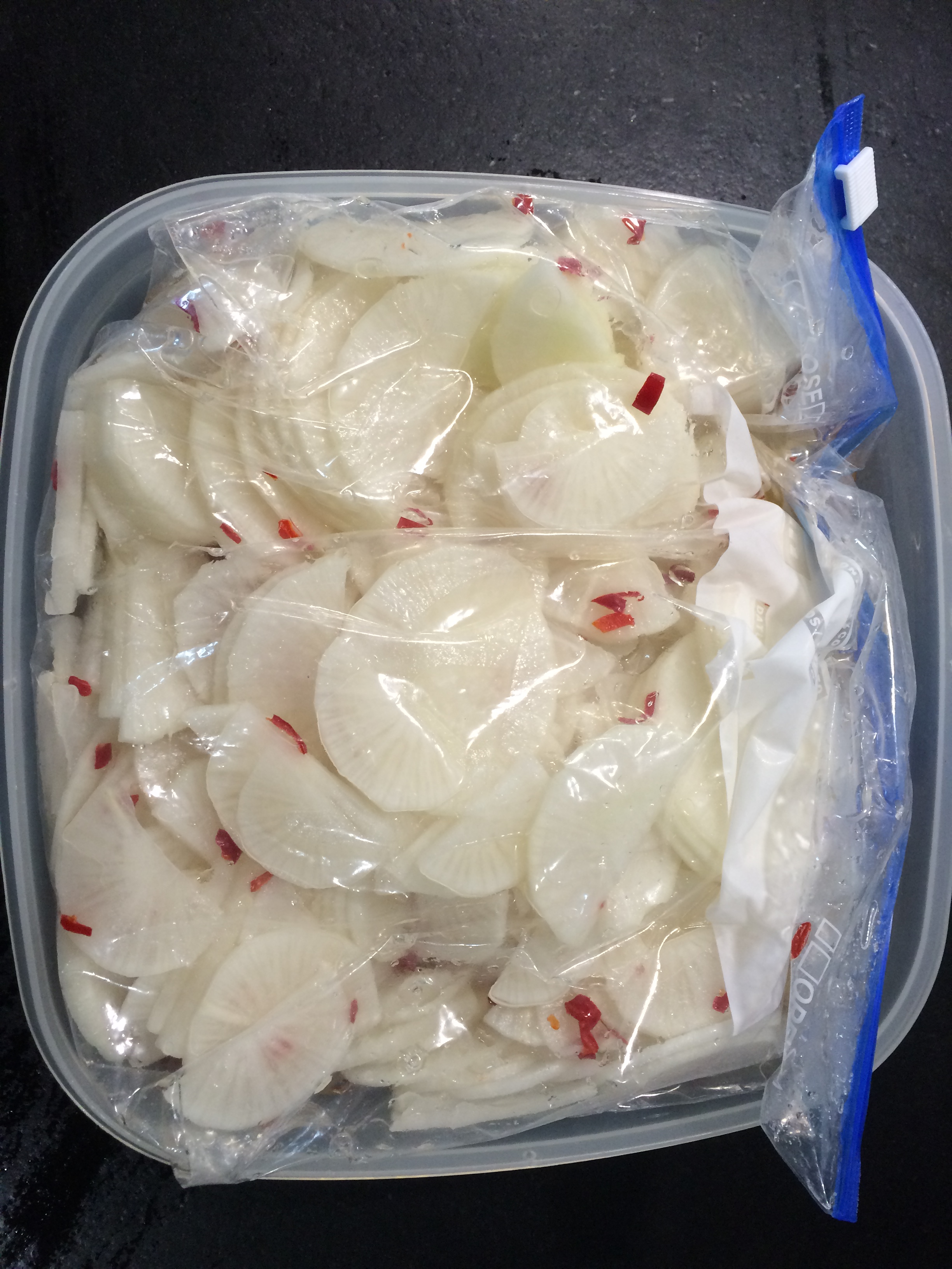 Put the daikon and the chillies in the Ziplock and then add the rest of the ingredients previously mixed.