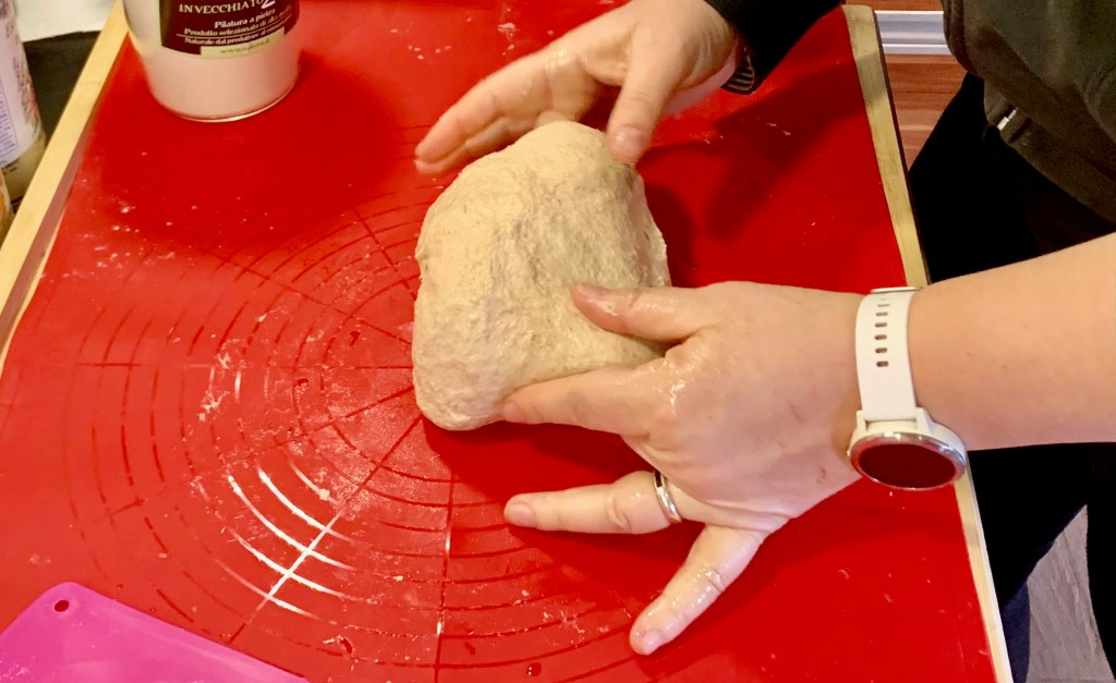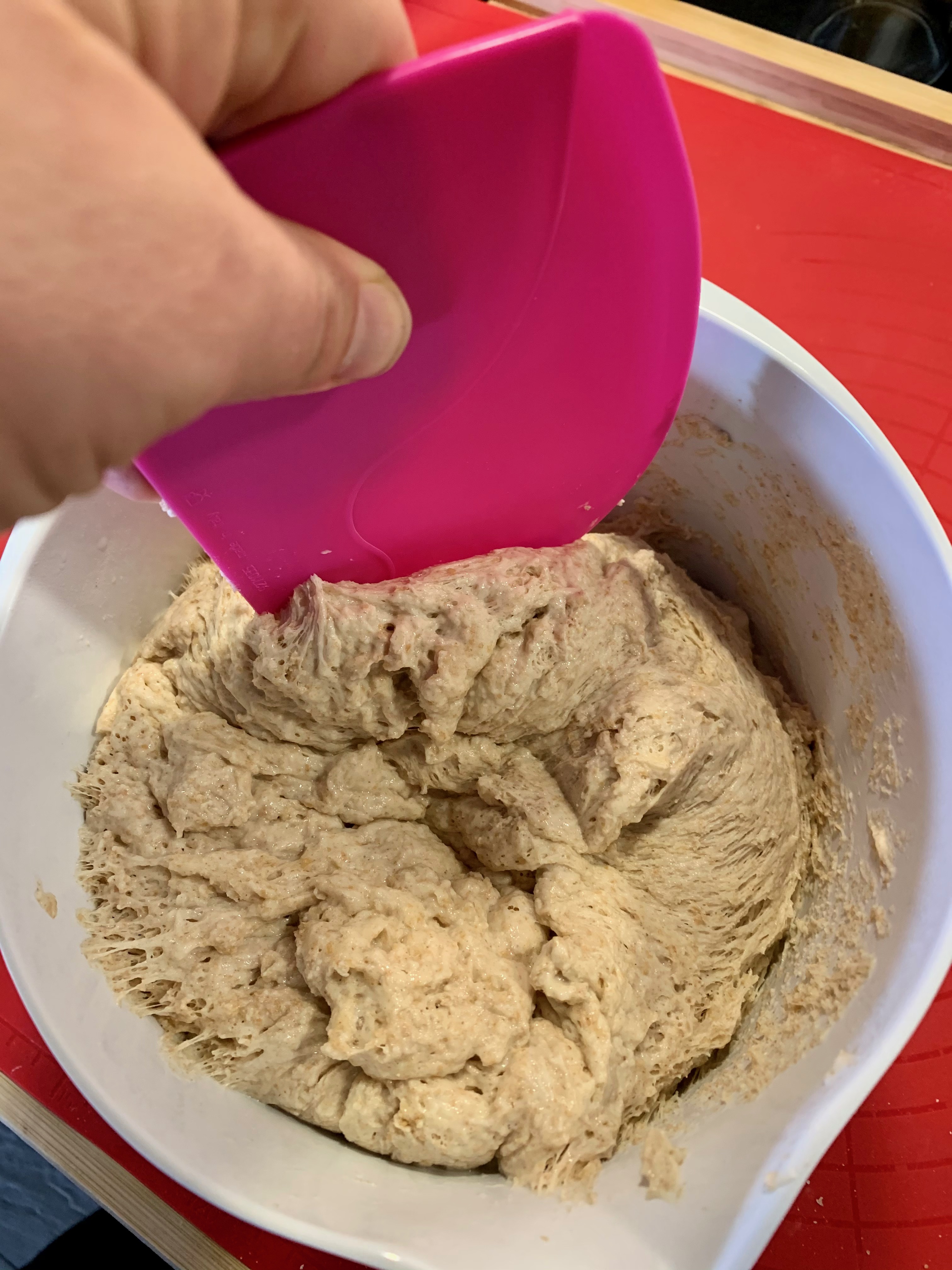 Now its is time for the first folding series. If you have a dough card/scraper it is ideal, otherwise you can use you hands (they need to be wet).